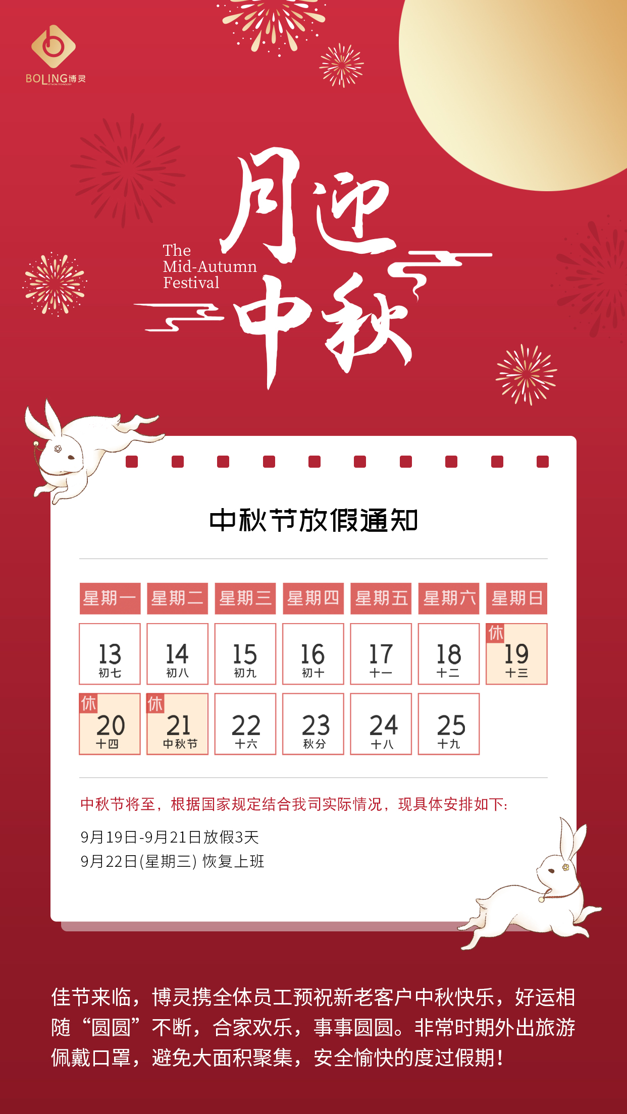 值此佳節(jié)來臨之際,博靈攜全體員工預(yù)祝新老客戶中秋快樂,好運(yùn)相隨“圓圓”不斷,合家歡樂,事事圓圓。非常時期外出旅游佩戴口罩,避免大面積聚集,勤洗手,多通風(fēng),安全愉快的度過假期!